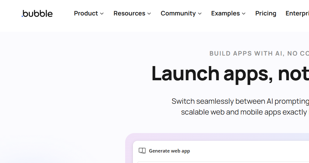 Bubble is an AI-powered no-code platform for building scalable web and mobile applications. Users switch seamlessly between AI prompting and visual editing to create full-stack apps without writing code. The platform includes a built-in database, hosting, security, and backend infrastructure. Bubble generates professional designs and functional backends from natural language prompts. Users can publish native mobile apps to iOS and Android app stores. The visual editor provides complete control over design and logic while handling enterprise-grade security and performance automatically.